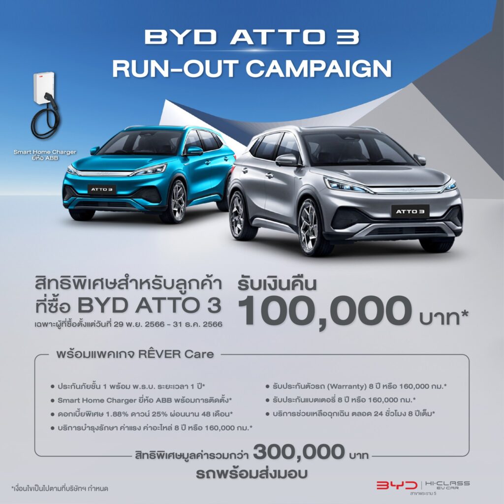 ที่สุดแห่งปี! ATTO 3 Run-out Campaign สำหรับลูกค้าใหม่ที่ซื้อ BYD ATTO3 ตั้งแต่วันที่ 29 พ.ย. 2566 – 31 ธ.ค. 2566 รับเงินคืน 100,000 บาท*